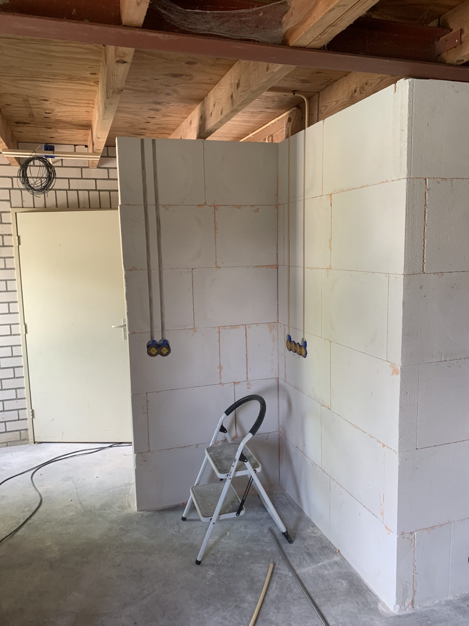 Om de installatie zo eenvoudig mogelijk te houden, heb ik alle stroom en lichtpunten samengebracht in één kabeldoos. Hiermee blijft het overzichtelijk en betaalbaar. De wandlampen worden geschakeld vanuit het woonhuis en de hanglamp via de aangebrachte schakelaar.