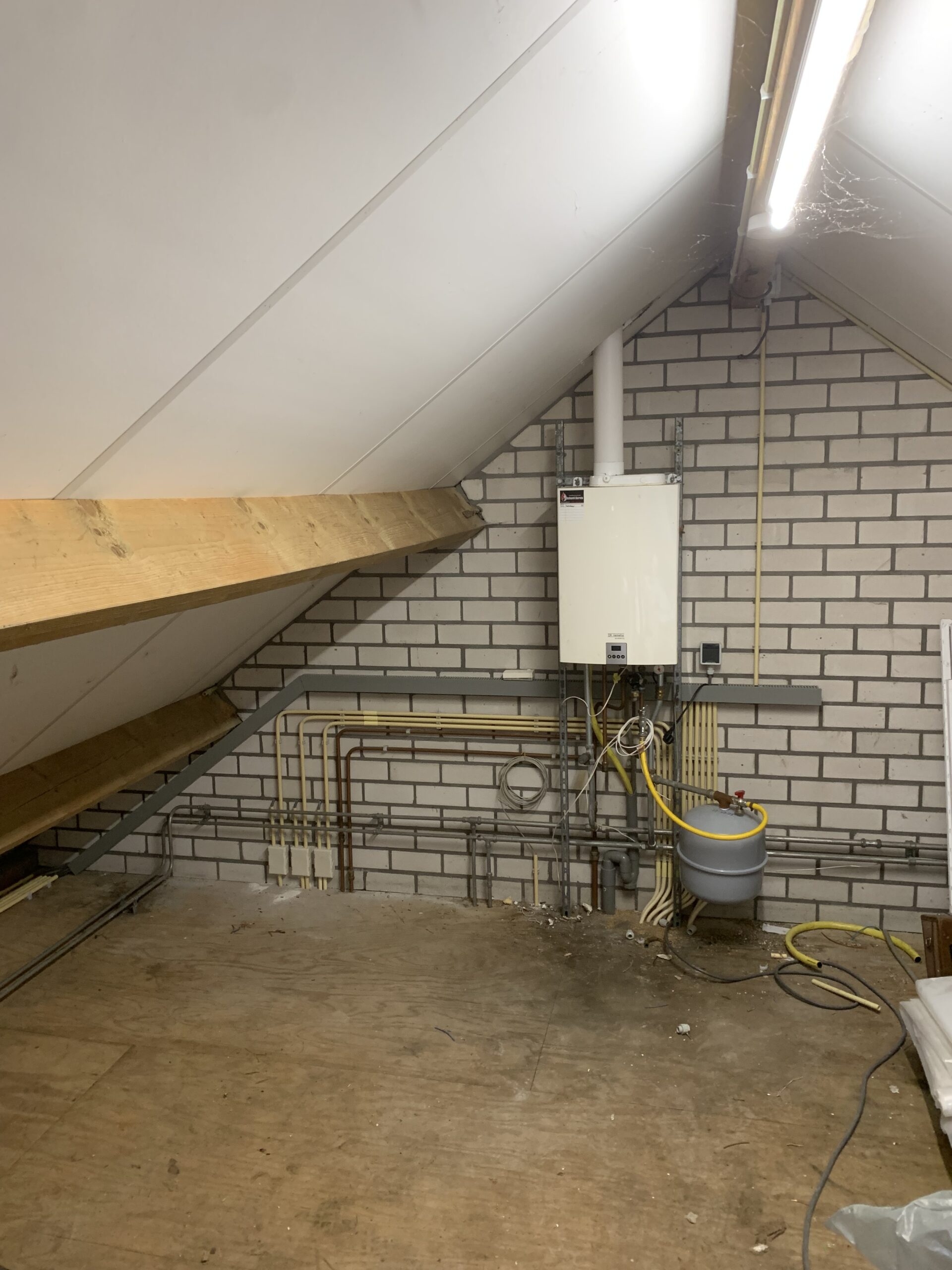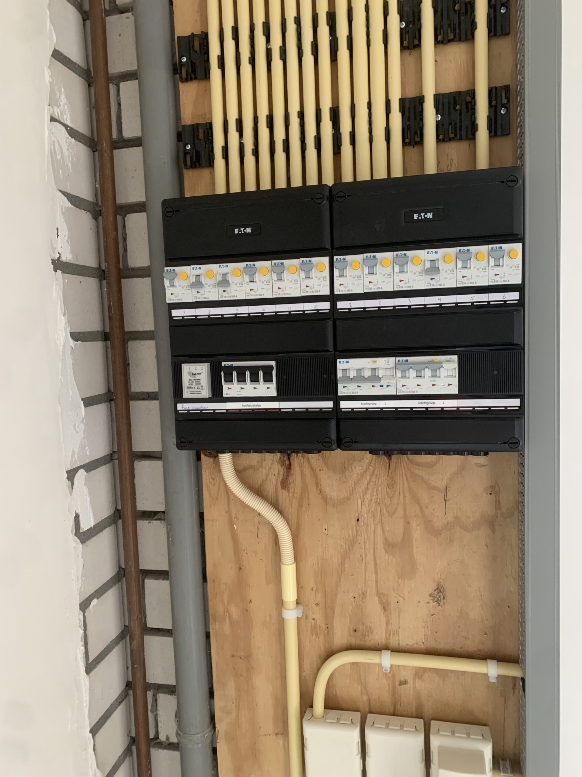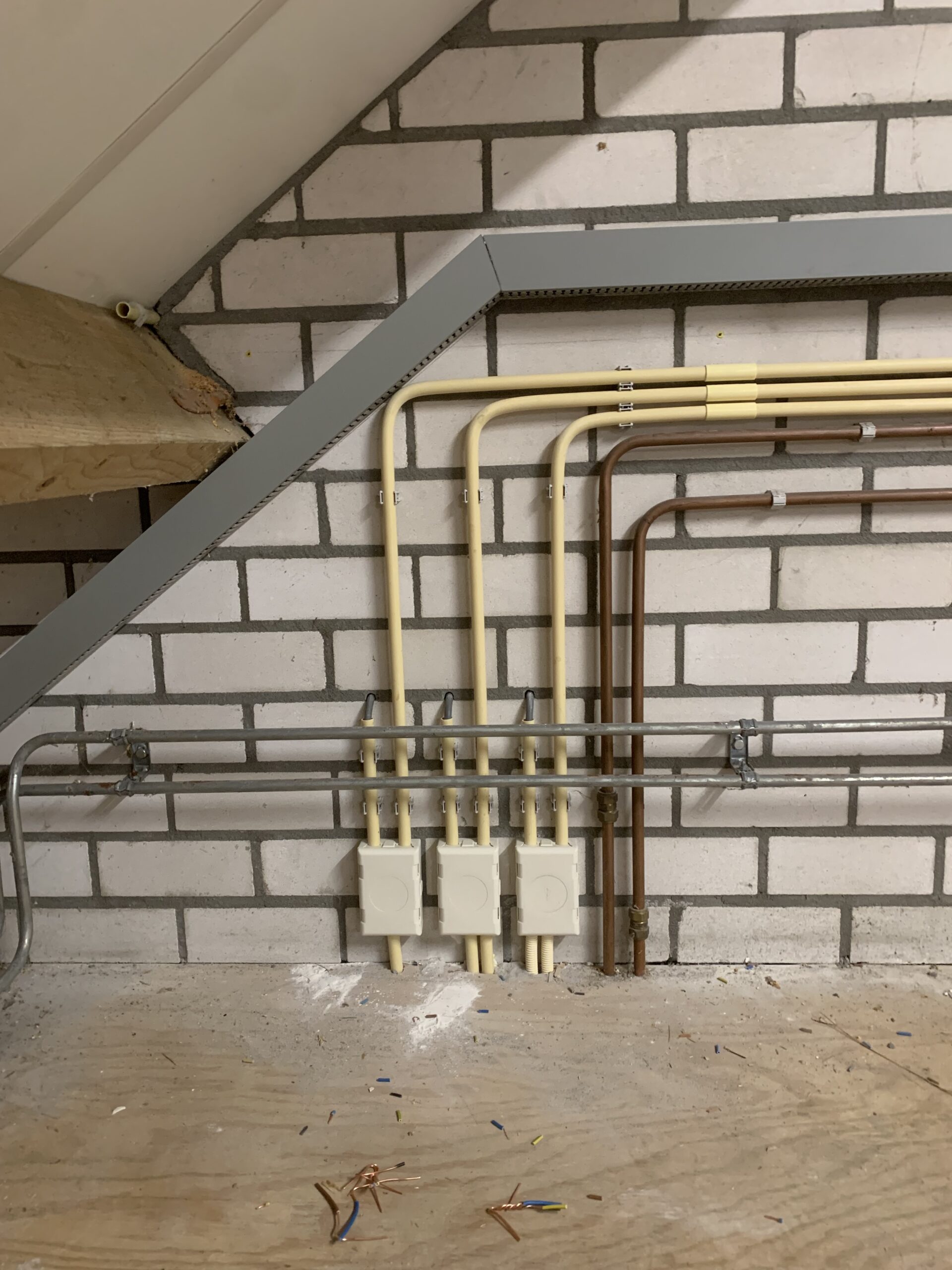Ik heb alle leidingen vrijgekapt zodat ik ze weer goed kon opvangen. Vervolgens heb ik ze rondom het trappengat verlegd, van nieuwe draad voorzien en samengebracht in een installatiekast.